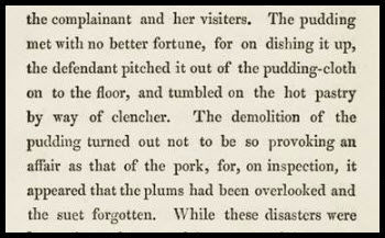 Heath’s account begins by setting forth the crime for which “the sturdy Irish Laundress, one Nelly Johnson” is ultimately accused: stealing the sum of “25 shillings” from Mrs Mary Clark. Nothing too out of the ordinary in 1838 London perhaps, but arguably the crime for which Nelly Johnson has no defence whatsoever is her truly awful cooking. With Mrs Clark forced to delegate the duty of preparing Christmas dinner to the defendant on the pretext of being “totally unable” to perform the task herself after having “so liberally partaken of the compliments of the season”, Nelly sets about the “arduous task of mixing the indispensable plum pudding”. And so the fun begins, as Heath so accurately summarises, “the history of the dinner was nothing but a series of disasters”. Whilst Nelly initially appears competent enough when “compounding the savoury ingredients of the pudding” it soon becomes clear that Nelly herself has overindulged “all morning imbibing antiffogmatics with her own friends”[s] thus reducing “her to a situation very little better than that of the complainant”. Somewhat unsurprisingly Nelly finds herself in a spot of bother, first pitching the “prime leg of pickled pork” into the fireplace as opposed to the intended pot, only then deciding with the aid of Mr Clark to pop “it in a pail which usually contained clean water, but which on that day, held a collection of slop”.